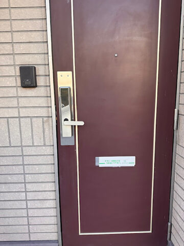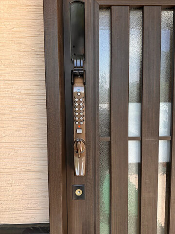 防犯性能を高めるため、キーレックス3100(自動施錠・暗証番号入力式)の両面仕様を住宅玄関ドアに取り付けた事例です。